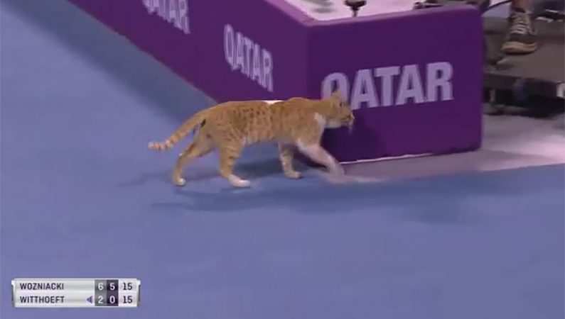 Рыжий кот, как и в прошлом году, по-хозяски прошелся по корту в Дохе во время матча.