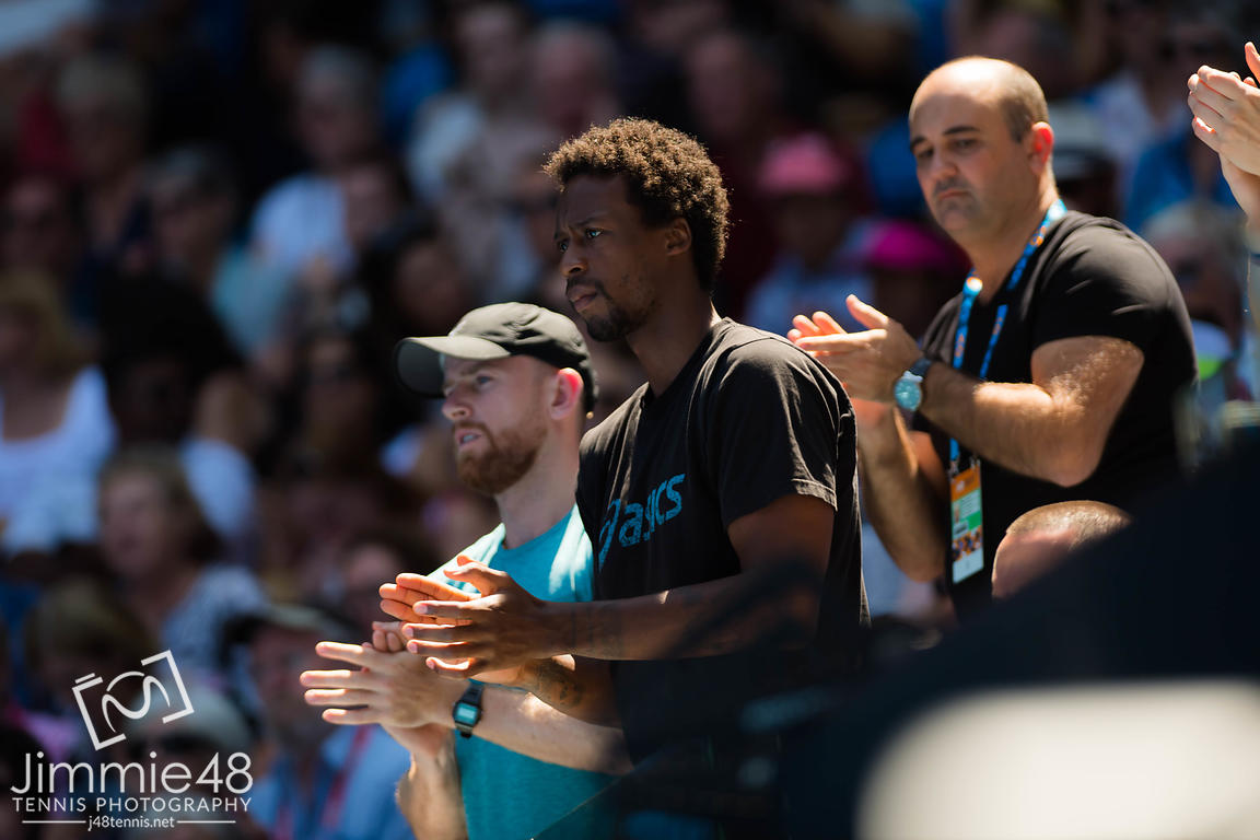 Gael Monfils cheers on girlfriend Elina Svitolina during her fourth-round match at the 2019 Australian Open Grand Slam tennis tournament