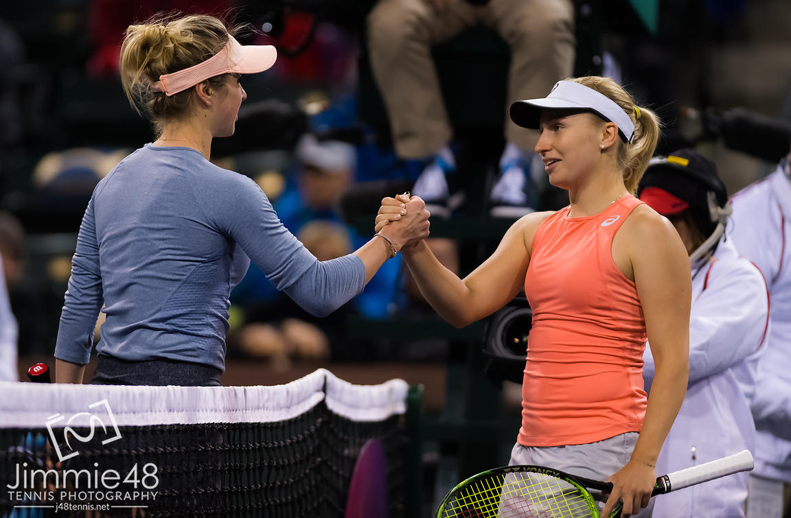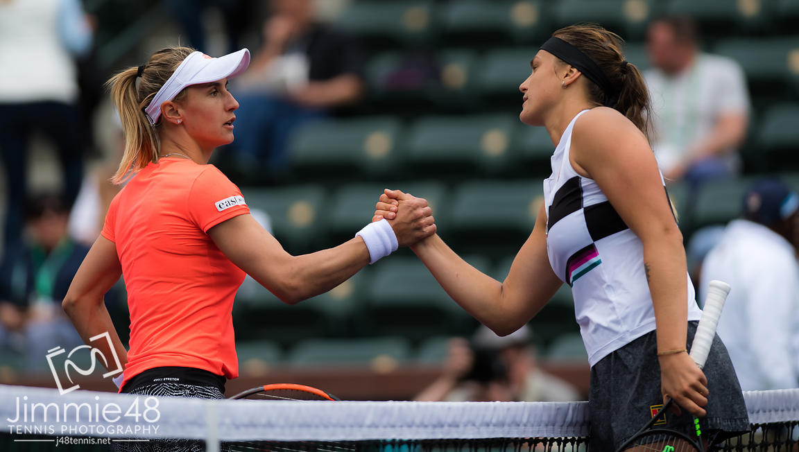 Lesia Tsurenko of the Ukraine & Aryna Sabalenka of Belarus at the net after their third-round match at the 2019 BNP Paribas Open WTA Premier Mandatory tennis tournament