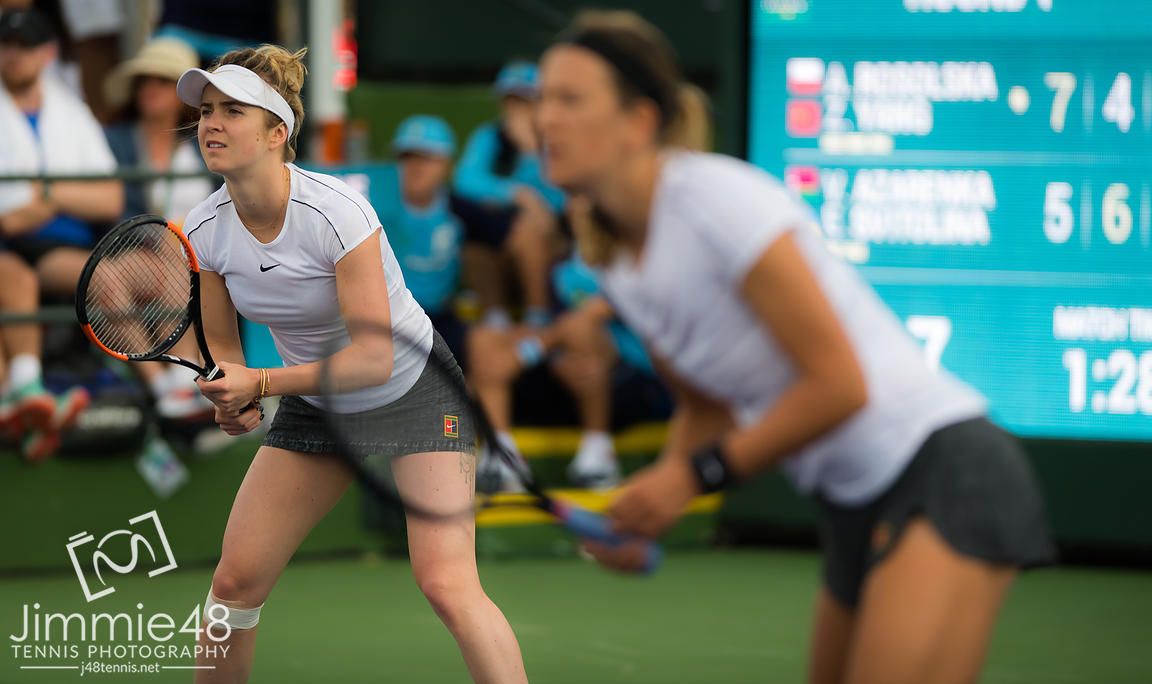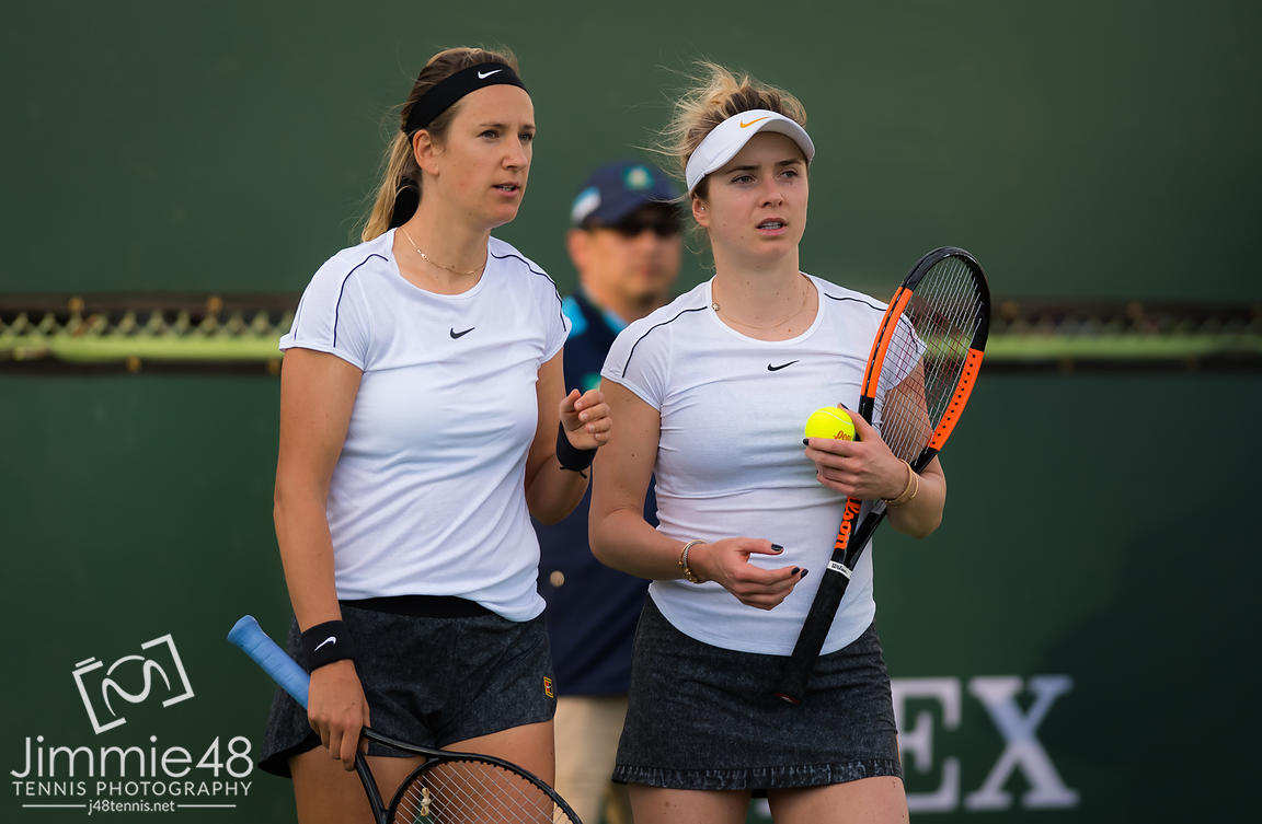 Elina Svitolina of the Ukraine & Victoria Azarenka of Belarus playing doubles at the 2019 BNP Paribas Open WTA Premier Mandatory tennis tournament