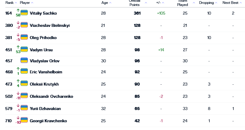 Український тенісист Віталій Сачко, який минулого тижня вперше дійшов до півфіналу турніру ATP-250, значно покращив своє положення в рейтингу ATP.