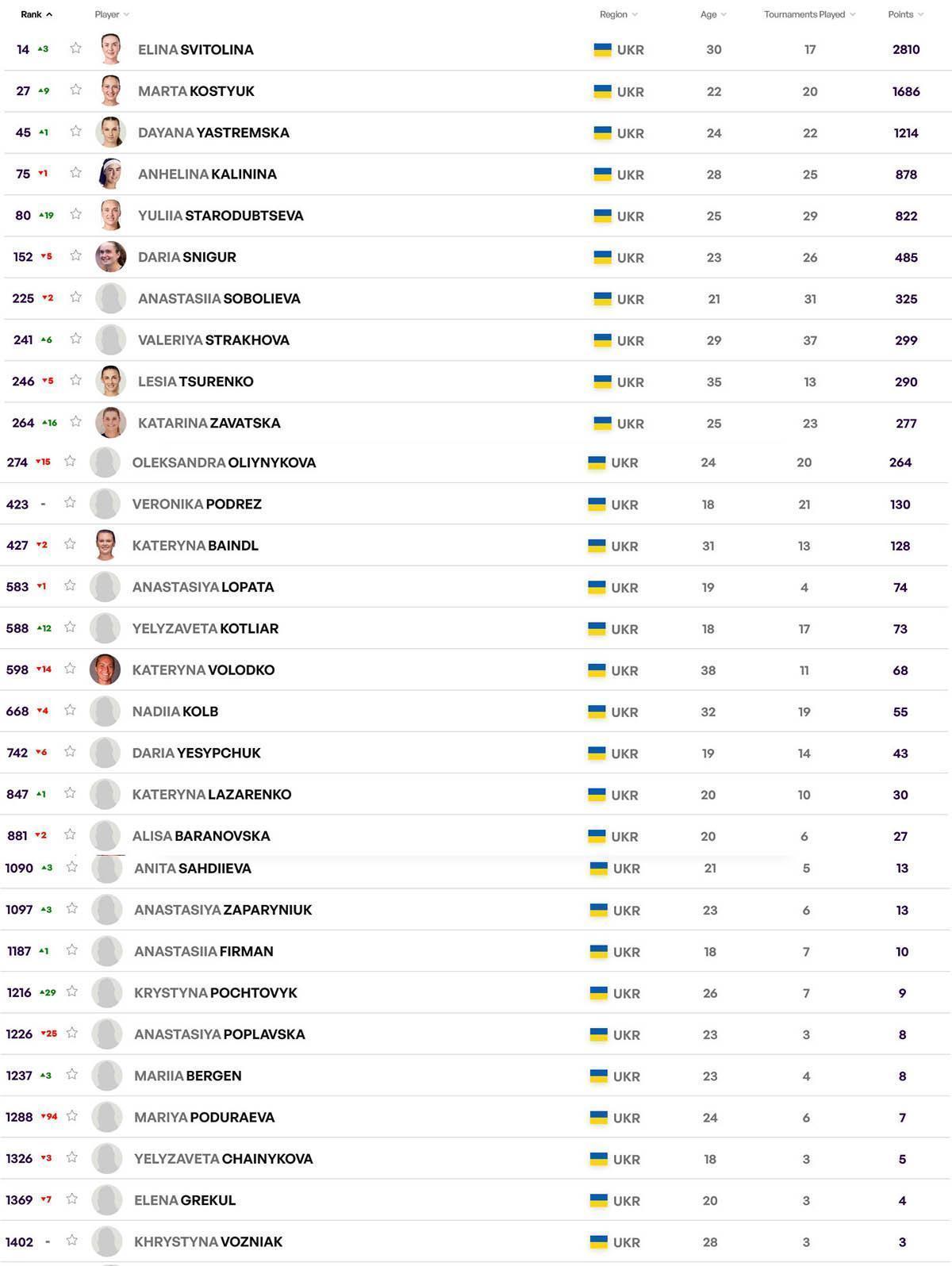 Позначки:WTA, Ангеліна Калініна, Даяна Ястремська, Еліна Світоліна, Марта Костюк, рейтинг, Юлія Стародубцева